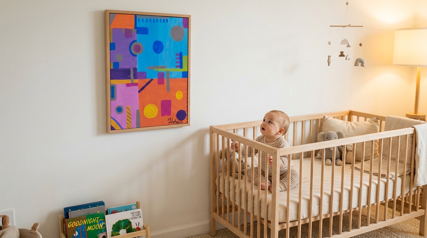 Abstract art, particularly the kind with strong colour blocks and clear forms, sits in this sweet spot naturally. It is not trying to depict realistic scenes, which require a level of visual processing your baby does not yet have. It gives the visual system exactly what it needs: clear signals.